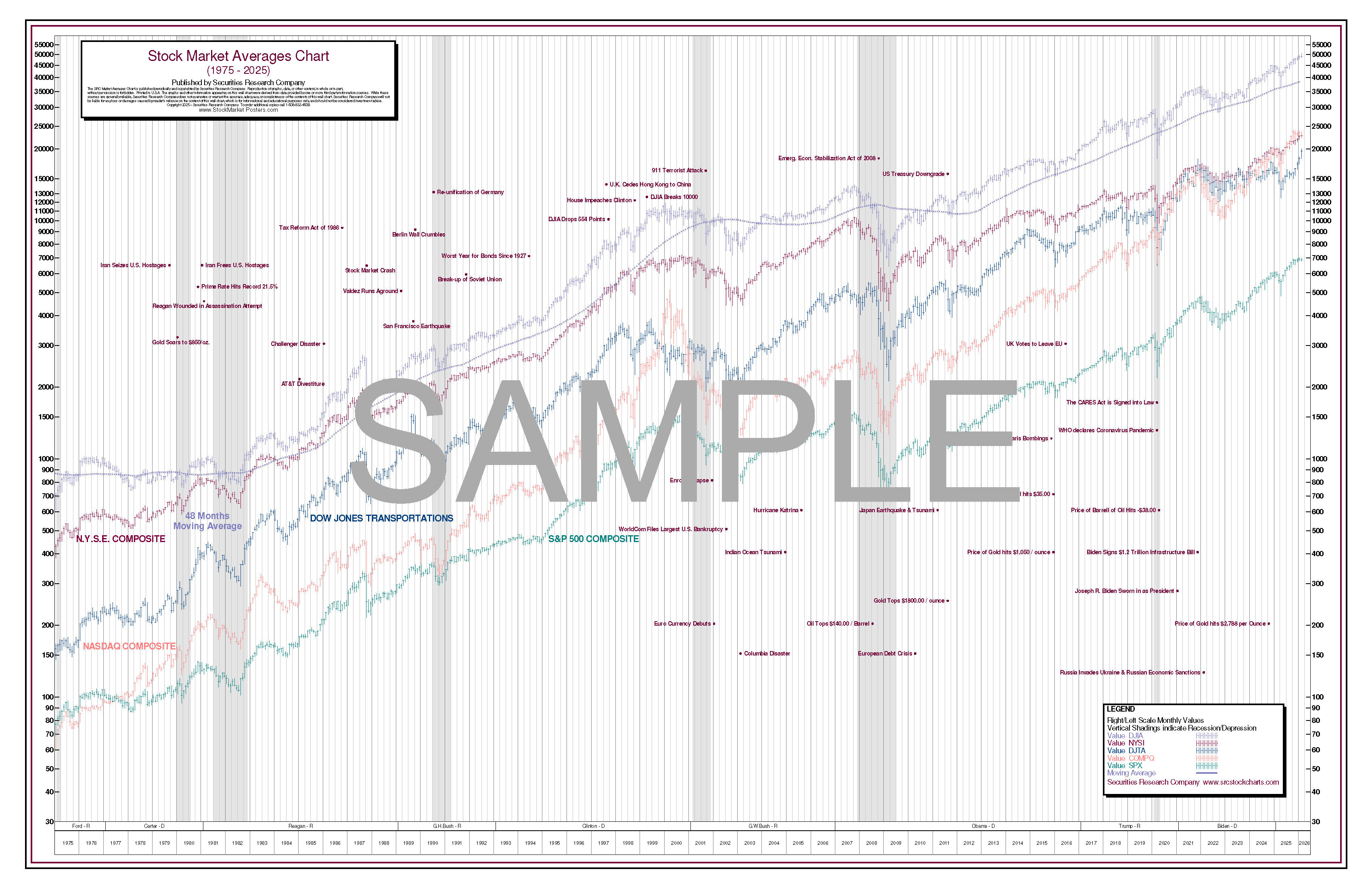 The 50-Year Stock Chart Poster – Market Average Composites provides a “visual history” of the stock market composites over the past 50 years, and adds a professional look to for the Office • Boardroom •  Lobby • Classroom • Home Office